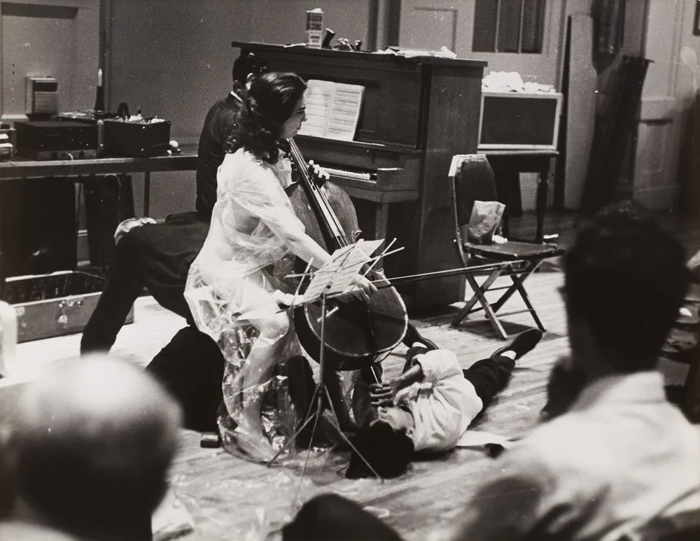 Photograph, Charlotte Moorman at Nam June Paik's Variations on a Theme by Saint-Saens
