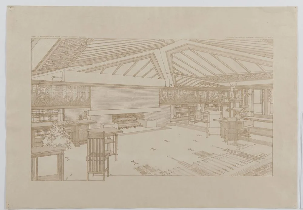 Wasmuth Portfolio: interior perspective of living area with fireplace, Avery Coonley House (circa 1907–1912), Riverside, Illinois, USA